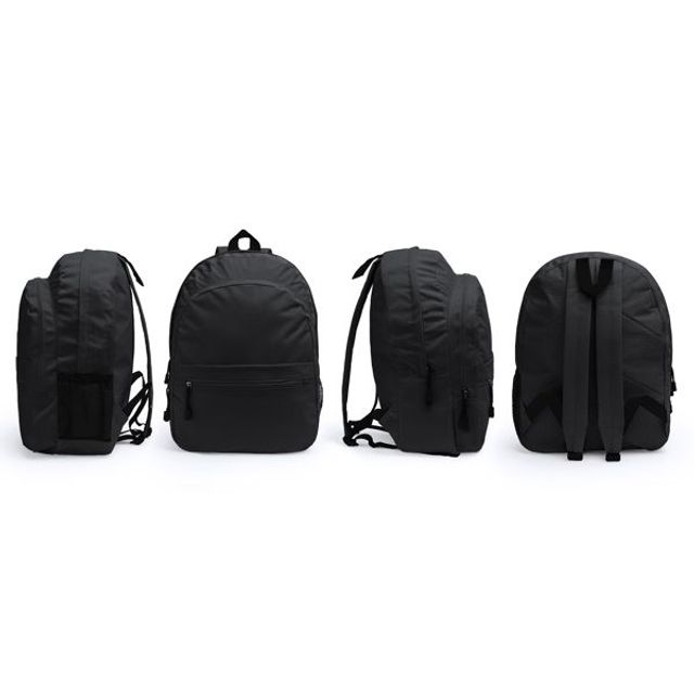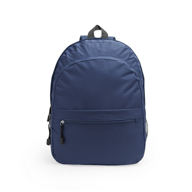 Zaino in poliestere 600D con due scomparti principali e tasca frontale. Tasca laterale in rete. Spallacci e schienale imbottiti.